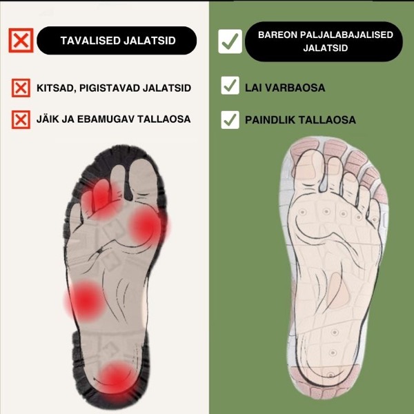 BAREONi paljajalu kingadega valite mugavuse, terved jalad ja loomuliku kõndimise. Need ainulaadsed jalanõud annavad teile paljajalu kõndimise tunde, pakkudes samas kaitset ja tuge.