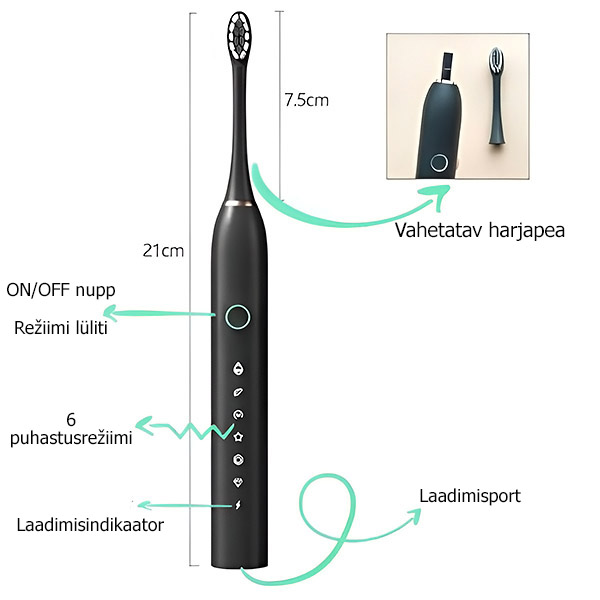 🦷 6 režiimi ja IPX7 veekindlusega on teie hambaravi rutiin just muutunud lihtsamaks ja tõhusamaks!